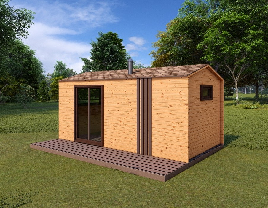 Баня-бочка «Пентагон» с панорамным окном Стильная и современная баня-бочка может быть выполнена длиною от 4 метров, с двумя отделениями (парилка и комната отдыха). Полок может быть, как с двух сторон, так и угловой, в стандарте двухуровневый. Печь в данной модели расположена сбоку с топкой внутрь парилки, либо наружу или в соседнее помещение. Печь можно укомплектовать баком для воды, а саму баню сделать длиною до 6 метров, комфортно разместив в ней дополнительно помывочную. Панорамное окно на входе добавит света и уюта в раздевалке. Установив баню в живописном месте, во время процедур можно наслаждаться видами из окна. В эту модель включено одно закаленное квадратное стекло в комнате отдыха. Обращаем Ваше внимание, по умолчанию в данной модели отсутствует бак для воды, вместо него идёт утеплённая термо-труба, которую можно заменить на бак по желанию.