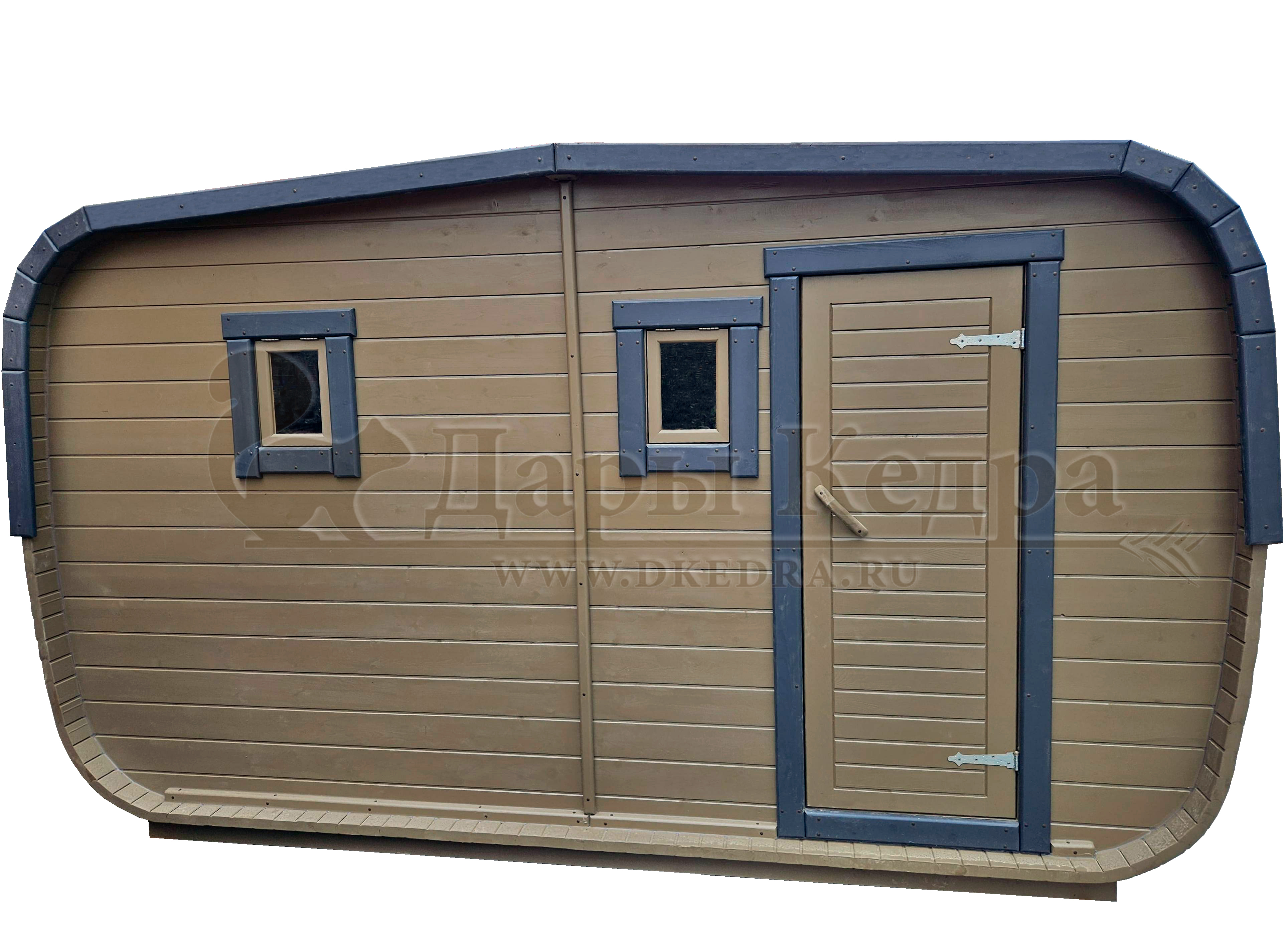 Баня-бочка буханка из кедра с козырьком (все размеры) Баня-буханка более просторная за счет увеличенной высоты потолков и ровного пола. Козырек не только украшает баню, но и защищает оставленную обувь от дождя. Лавочки из кедра находятся по всей длине бани-бочки с обеих сторон. Печь расположена в парилке около дальней стены. Время растопки такой бани не превышает 30 минут. В зависимости от выбранного размера баня-бочка буханка с козырьком имеет следующую комплектацию: Баня-бочка буханка 2,5 метра - парилка; Баня-бочка буханка 3,5 и 4,5 метра - раздевалка, парилка; Баня-бочка буханка 5,5 метров - раздевалка, парилка, моечная. По вашему желанию ее можно укомплектовать печью с внешней загрузкой, благодаря которой весь мусор вовремя топки остается на улице. Баня-бочка буханка не требует полноценный фундамент, поэтому при необходимости ее можно перенести в другое место. Обращаем Ваше внимание, что в стандартную комплектацию бани входят полки открытого типа в парной с обеих сторон. Дополнительно можно заказать полок закрытого типа или лавку! Кедр обладает ароматическими свойствами. Он не деформируется и влагоустойчив, при правильном уходе за деревом на нем не развиваются грибки и плесень.