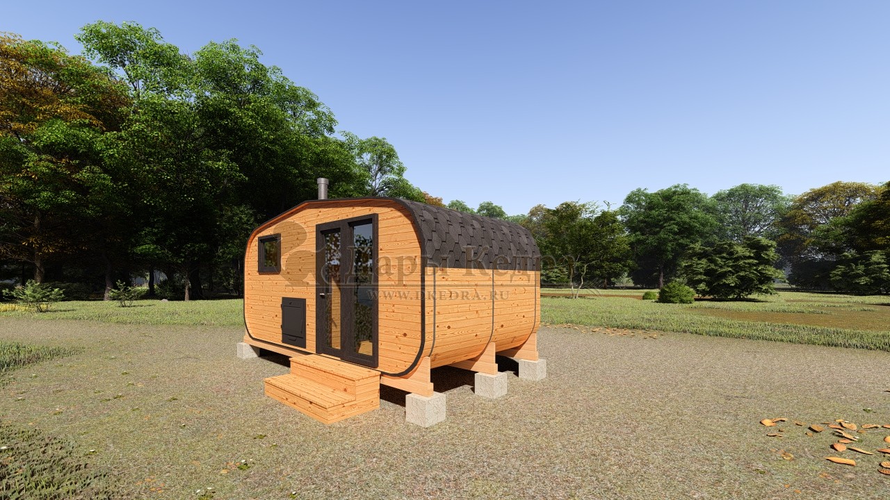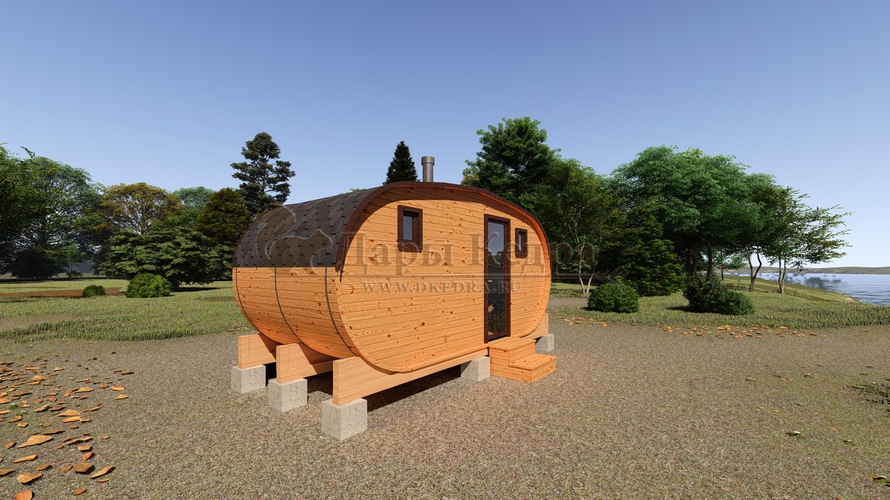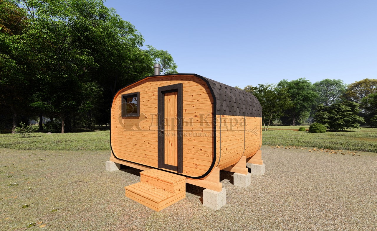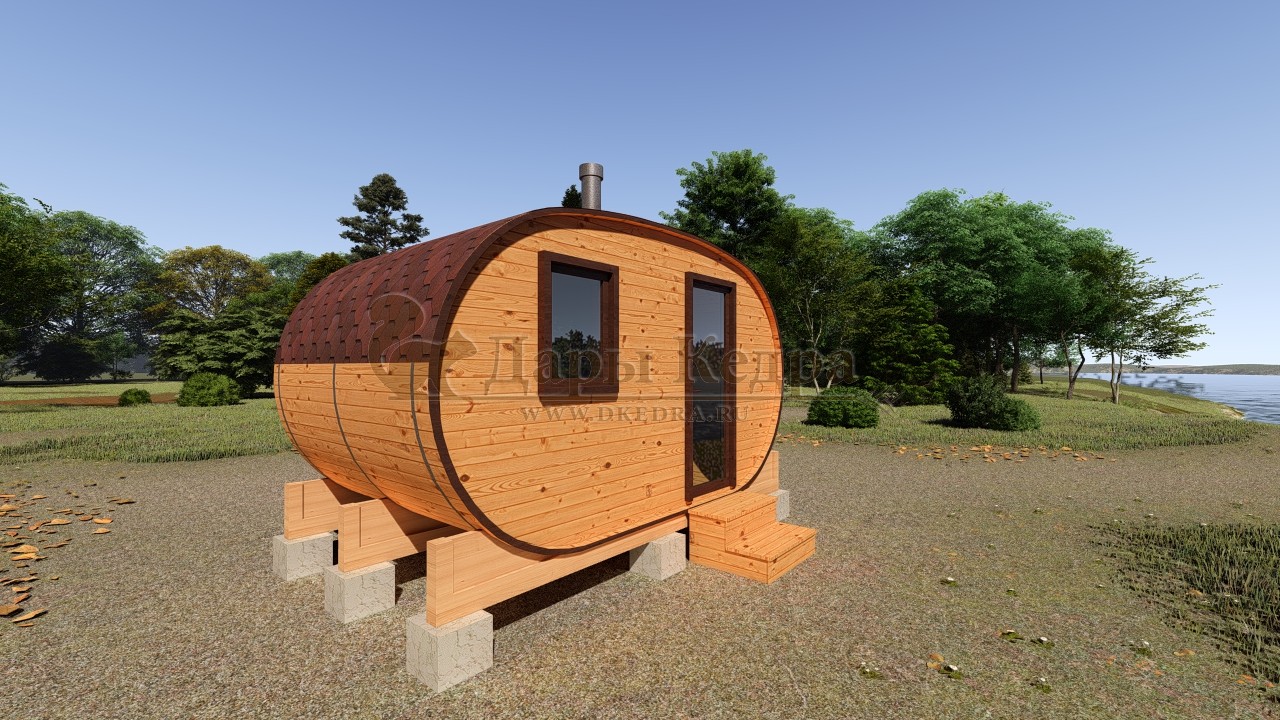 Симбиоз круглой и квадратной бани-бочки. Разработано с учётом эргономики, в ней так же просторно, как и в квадро-бочке, но при этом полукруглая крыша не дает задерживаться снегу и влаге на кровле. А еще такая баня безусловно красивая, мобильная и доступная каждому!
